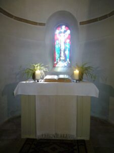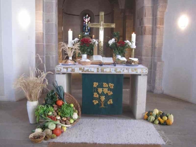Kanzel, Taufbecken und Altar wurden im Zuge der Renovierung in den 1960er Jahren z.T. durch die damalige Jugendgruppe neu gestaltet (Anstrich, Mosaike). Die Goldverzierung der Kanzel wurde erst später hinzugefügt.
